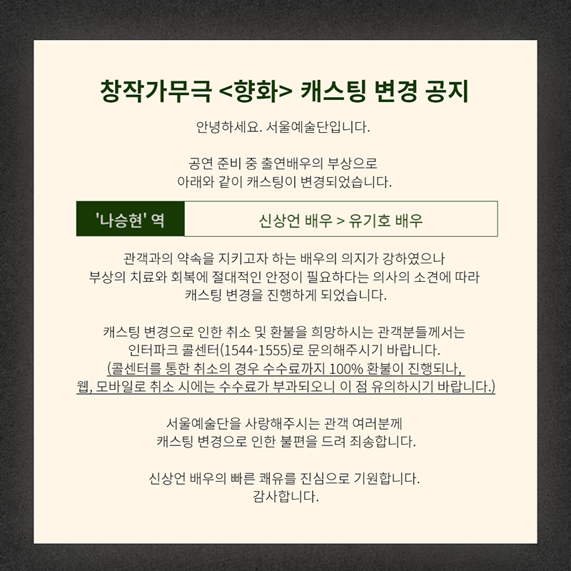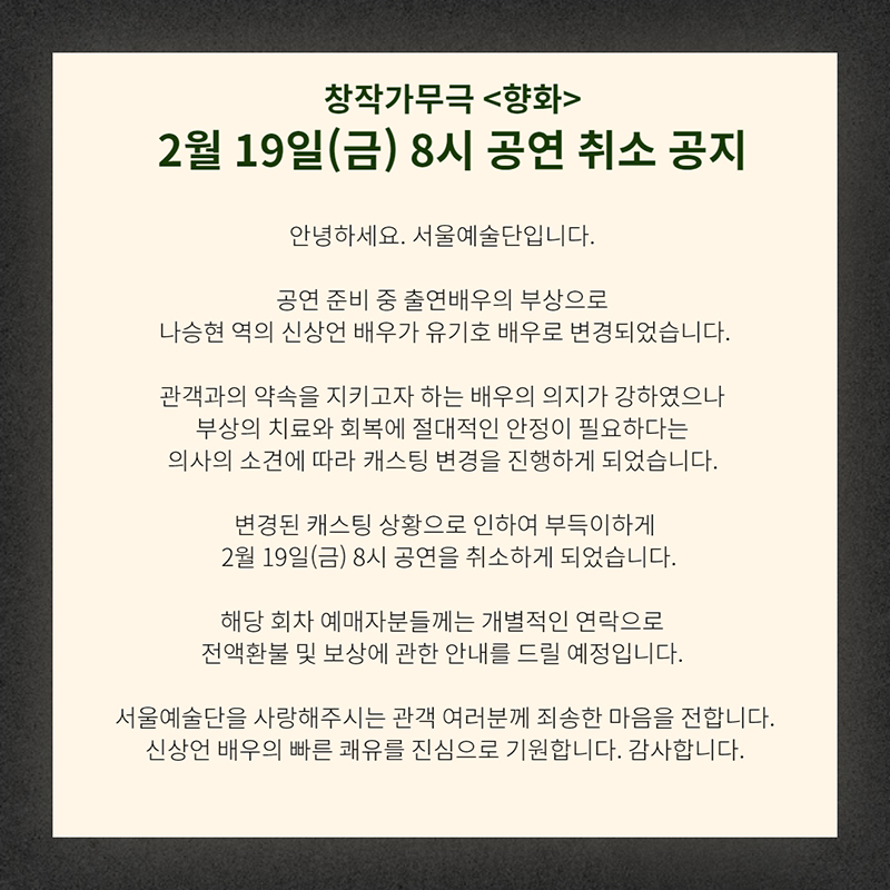 창작가무극 <향화> 캐스팅 변경 및 2월 19일(금) 8시 공연 취소공지
