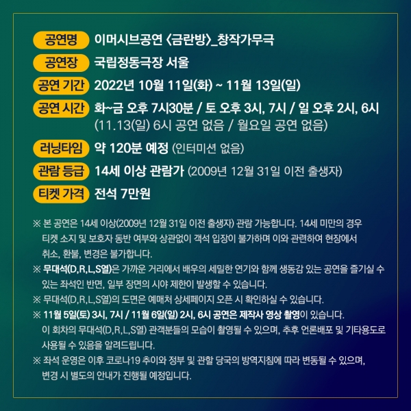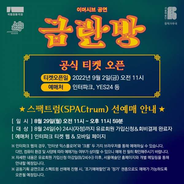 2022 이머시브공연 <금란방>_창작가무극 티켓오픈 안내 티켓오픈일 : 2022년 9월 2일(금) 오전 11시 공연정보 - 공 연 명 : 이머시브공연 <금란방>_창작가무극 - 공 연 장 : 국립정동극장 서울 - 공연기간 : 2022년 10월 11일(화) ~ 2022년 11월 13일(일) - 공연시간 : 화~금 오후 7시 30분 / 토 오후 3시, 7시 / 일 오후 2시, 6시 (11.13(일) 6시 공연 없음 / 월요일 공연 없음) - 러닝타임 : 약 120분 예정 (인터미션 없음) - 관람등급 : 14세이상 관람가(2009년 12월 31일 이전 출생자) - 티켓가격 : 전석 7만원 ※ 본 공연은 14세 이상(중학생 이상) 관람 가능합니다. 14세 미만의 경우 티켓 소지 및 보호자 동반 여부와 상관없이 객석 입장이 불가하며 이와 관련하여 현장에서 취소, 환불, 변경은 불가합니다. ※ 무대석(D,R,L,S열)은 가까운 거리에서 배우의 세밀한 연기와 함께 생동감 있는 공연을 즐기실 수 있는 좌석인 반면, 일부 장면의 시야 제한이 발생할 수 있습니다. ※ 무대석(D,R,L,S열)의 도면은 예매처 상세페이지 오픈 시 확인하실 수 있습니다. ※ 무대석 D,R,L열은 열과 열 사이에 단차가 있으며, D열 11번, 20번 / R열 1번, 8번 / L열 1번, 8번은 출연배우석으로 판매하지 않습니다. ※ 무대석 S열은 기존 OP석 공간에 위치해 있습니다. S열 좌석은 무대보다 낮은 구역이며, 객석 간의 단차가 없으며, 높은 바 의자와 테이블이 배치되어 있습니다. ※ B열 1~8번 좌석 마감으로, B열의 실제 관람 좌석은 9~16번부터 시작됩니다. ※ A열 1번, 8번, 15번 / C열 7번, 14번, 21번 좌석은 판매 보류되었으며, 무대 설치 상황에 따라 추후 오픈될 수 있습니다. ※ 무대석(D,R,L,S열) 관객분들은 커튼콜 시 배우분들과 함께 촬영될 수 있습니다. ※ 11월 5일(토) 3시, 7시 / 11월 6일(일) 2시, 6시 공연은 제작사 영상 촬영이 있습니다. 이 회차의 무대석(D,R,L,S열) 관객분들의 모습이 촬영될 수 있으며, 추후 언론배포 및 기타용도로 사용될 수 있음을 알려드립니다. ※ 공식 티켓오픈일인 9월 2일(금) 전에 서울예술단 및 국립정동극장 회원 선예매가 있습니다. 일정은 아래와 같습니다. ※ 좌석 운영은 이후 코로나19 추이와 정부 및 관할 당국의 방역지침에 따라 변동될 수 있으며, 변경 시 별도의 안내가 진행될 예정입니다. <선예매 일정> ● 서울예술단 유료회원(SPACtrum) 선예매 - 일시 : 8월 29일(월) 11:00 ~ 23:59 - 예매처 : 인터파크 - 대상 : 8월 24일(수) 24시(자정)까지 유료회원 가입신청 및 회비결제 모두 완료자 - 오픈 권종 : SPACtrum 회원할인 40%(전기간 총 4매) / 조기예매할인 30%(1인 4매) / 정가 7만원