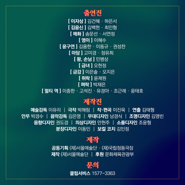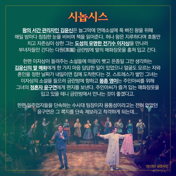 ● 국립정동극장 홈페이지 회원(Hello, 정동 메이트) 선예매 - 일시 : 8월 30일(화) 11:00 ~ 23:59 - 예매처 : 국립정동극장 홈페이지(정동극장 홈페이지와 인터파크 예매 좌석 연동) - 대상 : 국립정동 홈페이지 가입자 - 오픈 권종 : Hello, 정동 메이트 할인 10%(전기간 총 4매) / 조기예매할인 30%(1인 4매) / 정가 7만원 * 자세한 사항은 각 단체에서 공지 예정 할인정보 SPACtrum 회원할인 40% (전기간 총 4매) Hello, 정동 메이트 할인 10% (1인 4매) 조기예매할인 30% (1인 4매) - 9월 12일(수)까지 예매 시 적용 일자별 캐스트 스케줄 및 자세한 할인정보는 추후 공지됩니다. 예매페이지 상세정보를 참조하세요. 공연소개 더욱 완성도 높은 이머시브 공연으로 4년 만에 돌아오는 서울예술단 창작가무극 <금란방> /다양한 관객 참여형 공연 연출을 해온 김태형 연출 합류/ 올해 10월, 서울예술단 창작가무극 <금란방>이 서울예술단과 국립정동극장 공동기획으로 4년 만에 새롭게 돌아온다. 특히, 이번 두 번째 시즌은 다양한 관객 참여형 공연을 시도해 온 김태형 연출이 새롭게 합류, 기존 극장형(프로시니엄) 이머시브 공연을 확장하는 작업을 통해 관람자인 관객을 밀주방에 찾아온 ‘손님’으로 설정하여 관객들이 보다 적극적이고 능동적으로 공연에 참여하도록 하는 다양한 시도가 주목된다. 또한, 김태형 연출은 “초연을 이어받아 더욱 흥미진진한 공간을 만들어 보고자 한다. 무언가 금기될 때 그것이 왜 금기되었는가 들여다보고 우리의 삶을 옭아매고 있다면 때론 깨고 나아가야 한다. 공연공간을 새롭게 탈바꿈하고 흥겨운 장을 열어 관객이 더 몰입하고 적극적으로 체험할 수 있는 신나는 시간을 준비하려 한다.”라고 작품 연출 의도를 밝혔다. /꿈꾸는 모든 것이 가능한 <금란방>/ <금란방>은 강력한 금주령이 시행된 18세기 조선 영조 시대에 있었을 법한 밀주방을 배경으로 펼쳐지는 유쾌한 소동극으로 비밀스러운 공간에서 쉴 틈 없이 휘몰아치는 전개와 스토리를 통해 짜릿하고 통쾌한 관극 체험을 선사할 예정이다. 특히, 이번 재연은 대본과 음악 등 대대적 수정을 통해 단순히 금기를 깨는 것을 넘어 억압받았던 관습과 통념을 깨고 자유롭게 꿈꾸며 삶의 의미를 찾아가는 주제를 더 명확히 보여준다. 극 중 ‘금주령’ 등이 내려진 엄격하고 절제된 시대 배경은 곧 현재 우리가 살고있는 사회와 다를 바 없다. 꿈꾸지만 꿈꾸는 대로 이뤄지지 않아 절망하고 더 갈망하는 우리의 현실처럼 말이다. <금란방>은 보이지 않아도 느끼고 있는 현실의 한계, 그리고 깊이 엉킨 실타래를 풀어낼 수 있는 공간이자 재미를 넘어 꿈에 대한 메시지를 던져주는 작품이다. /대체 불가 원년 멤버와 기대되는 신예의 조화/ 2018년 초연 당시 뜨거운 호평을 받았던 서울예술단의 김건혜, 김백현, 최인형, 송문선, 이혜수, 김용한이 다시 한번 무대에 오르며 더욱 깊이 있는 연기와 공감을 끌어낼 예정이다. 여기에 <잃어버린 얼굴 1895>에서 폭발적인 가창력으로 카리스마 넘치는 명성황후 역을 선보인 하은서와 서울예술단 신예 서연정, 이동규, 권성찬이 새롭게 캐스팅되어 서울예술단 단원들의 다채로운 조화를 보여줄 것으로 기대를 모으고 있다. 러닝타임 내내 무대와 관객 사이의 매개자 역할을 하는 조선 최고의 전기수, ‘이자상’ 역은 김건혜, 하은서가 나란히 캐스팅 되었으며, 왕의 서간 관리자로 낭독기술이 절실한 ‘김윤신’ 역은 김백현, 최인형, 그런 김윤신의 하나밖에 없는 철없는 외동딸 ‘매화’ 역에는 송문선, 서연정, 철딱서니 없는 매화의 몸종 ‘영이’ 역은 이혜수, 그리고 고지식한 인물이자 사랑 따위에는 전혀 관심 없는 밀주단속반 팀장 ‘윤구연’ 역에는 김용한, 이동규, 권성찬이 트리플 캐스팅되어 다양한 매력을 선보일 예정이다. /SYNOPSIS/ 왕의 서간관리자인 김윤신은 늘그막에 연애소설에 푹 빠진 왕을 위해 매일 밤마다 침침한 눈을 비비며 책을 읽어준다. 허나 왕은 지루하다며 호통만 치고 자존심이 상한 그는 도성의 유명한 전기수 이자상을 만나러 부녀자들만 간다는 다원(茶園) 금란방에 딸의 매화장옷을 훔쳐 입고 간다. 한편 이자상이 들려주는 소설들에 마음이 뺏고 온종일 그만 생각하는 김윤신의 딸 매화에게 한 가지 마음 답답한 일이 있었으니 얼굴도 모르는 자와 혼인을 정한 날짜가 내일이면 집에 도착한다는 것. 스트레스가 쌓인 그녀는 이자상의 소설을 들으러 금란방에 향하고 몸종 영이는 주인아씨를 위해 그녀의 정혼자 윤구연에게 편지를 보낸다. 주인아씨가 즐겨 입는 매화장옷을 입고 있을 테니 금란방에서 만나는 것이 좋겠다고. 한편 밀주업자들을 단속하는 수사대 팀장이자 융통성이라고는 전혀 없었던 윤구연은 그 쪽지를 단속제보라고 착각하게 되는데... 출연진 이자상 | 김건혜 · 하은서 김윤신 | 김백현 · 최인형 매 화 | 송문선 · 서연정 영 이 | 이혜수 윤구연 | 김용한 · 이동규 · 권성찬 마 담 | 고미경 · 정유희 왕 | 민병상 금 녀 | 오현정 금 강 | 이은솔 · 오지은 쥐 락 | 윤제원 펴 락 | 박재은 멀티 역 | 고석진 · 이종한 · 유경아 · 조근래 · 윤태호 제 작 진 예술감독 | 이유리 극 작 | 박해