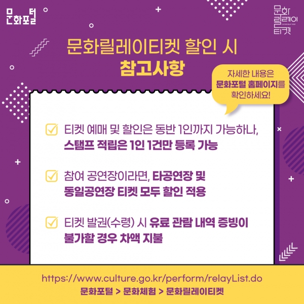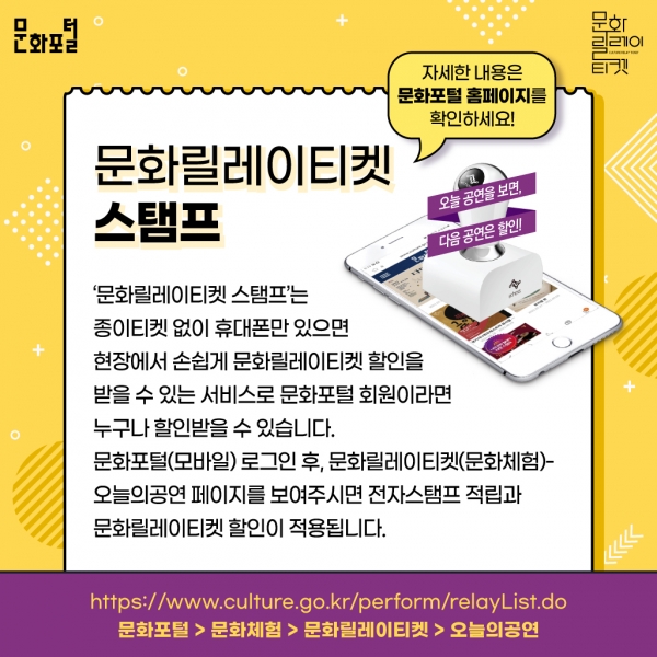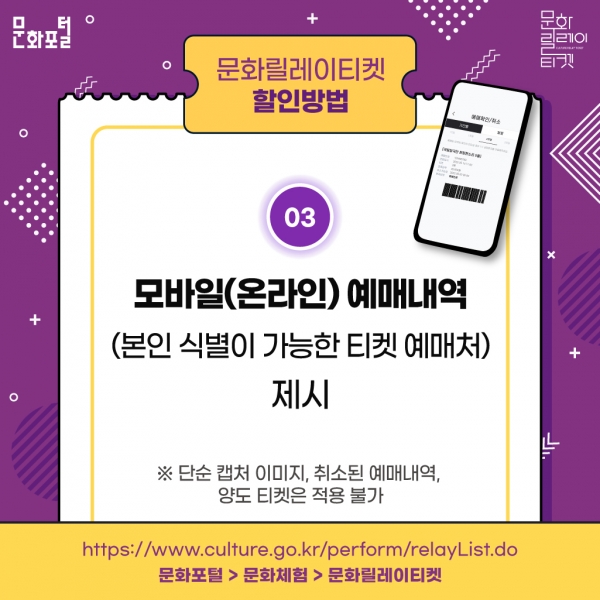 9월 1일(목)부터 문화릴레이티켓 할인증빙이 모바일내역서로도 가능합니다. (단, 본인식별이 가능해야함)