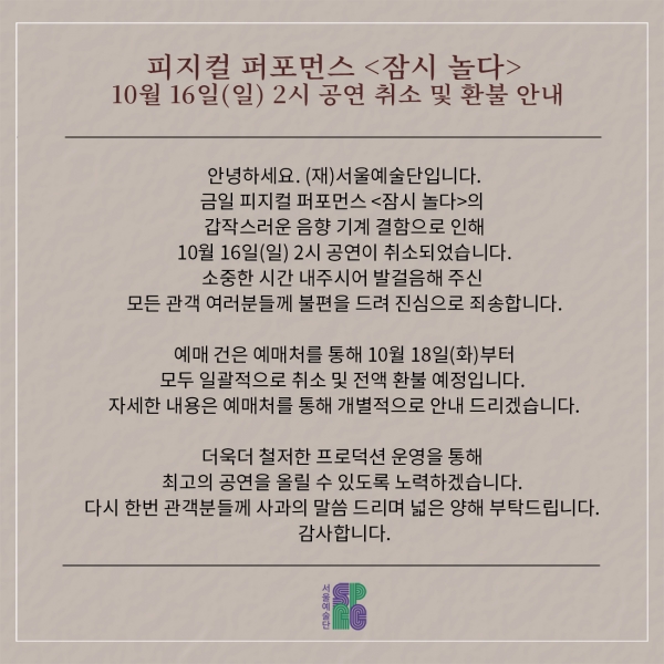 안녕하세요. (재)서울예술단입니다. 금일 피지컬 퍼포먼스 <잠시 놀다>의 갑작스러운 음향 기계 결함으로 인해 10월 16일(일) 2시 공연이 취소되었습니다. 소중한 시간 내주시어 발걸음해 주신 모든 관객 여러분들께 불편을 드려 진심으로 죄송합니다. 예매 건은 예매처를 통해 10월 18일(화)부터 모두 일괄적으로 취소 및 전액 환불 예정입니다. 자세한 내용은 예매처를 통해 개별적으로 안내 드리겠습니다. 더욱더 철저한 프로덕션 운영을 통해 최고의 공연을 올릴 수 있도록 노력하겠습니다. 다시 한 번 관객분들께 사과의 말씀 드리며 넓은 양해 부탁드립니다. 감사합니다. |