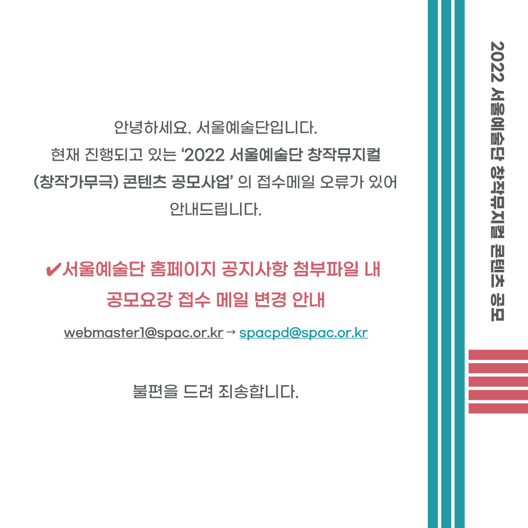 현재 진행되고 있는 ‘2022 서울예술단 창작뮤지컬(창작가무극) 콘텐츠 공모사업’ 의 접수메일 오류가 있어 안내드립니다.